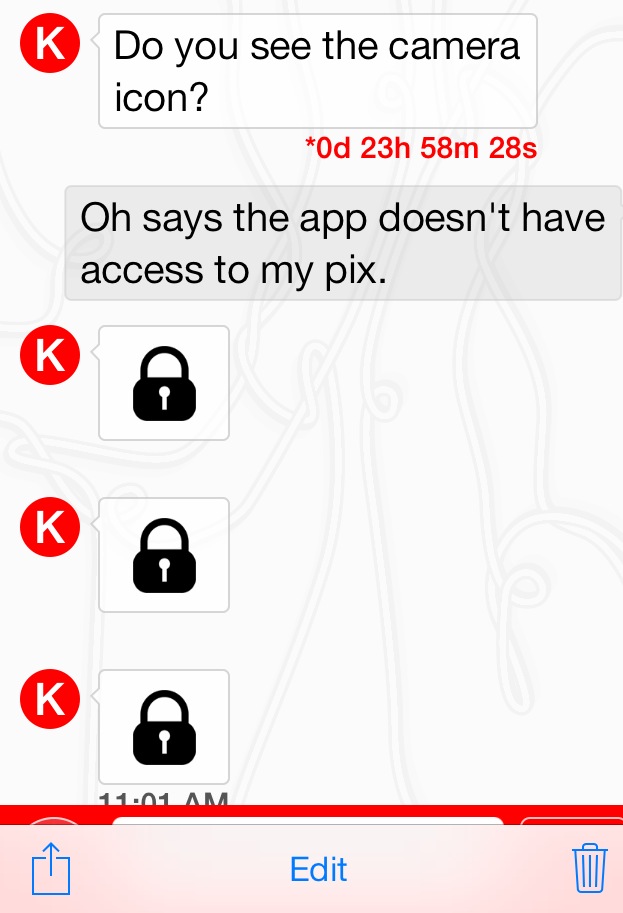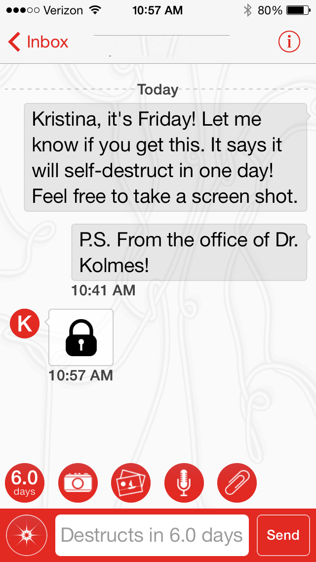 KK: You can see the red text, below, indicating the time until a message self-destructs. I also like that there is a padlock you have to click on in order to unlock each message. This is just one extra step to ensure nobody is looking over your shoulder. I also like that from the texting screen, you can click on various red round buttons to change the self-destruct time for each message (from seconds to six days), to activate the camera to take and attach a photo, to access your photo album and choose a photo, to activate your microphone to record and send sound file, or to attach and send other attachment from dropbox or Google Drive.